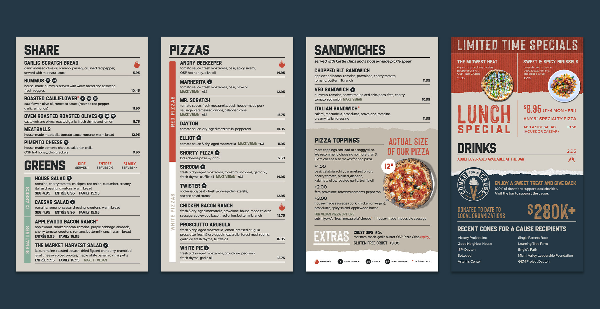 Old Scratch Pizza launched in 2016 with a solid visual identity. They saw growth, and popularity. They wanted to become more than a local restaurant. The previous visual identity was well-crafted, but blended in in the pizza market. And Old Scratch is anything but ordinary. We crafted language and a look around the idea of "Midwesternly Neapolitan" pizza and extended it to the locations, website, merch, and much more. Not just another wood-fired pizza place. They are Old Scratch!